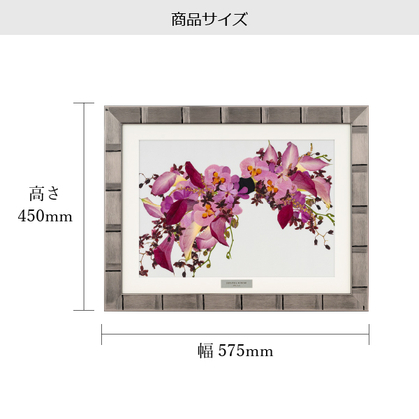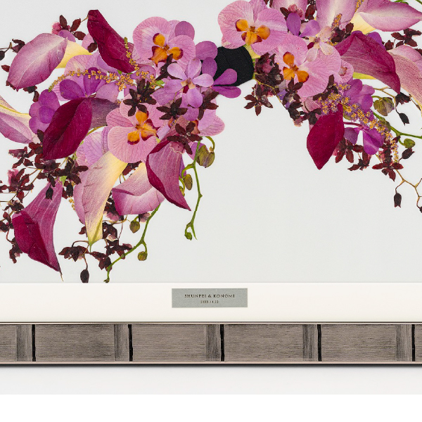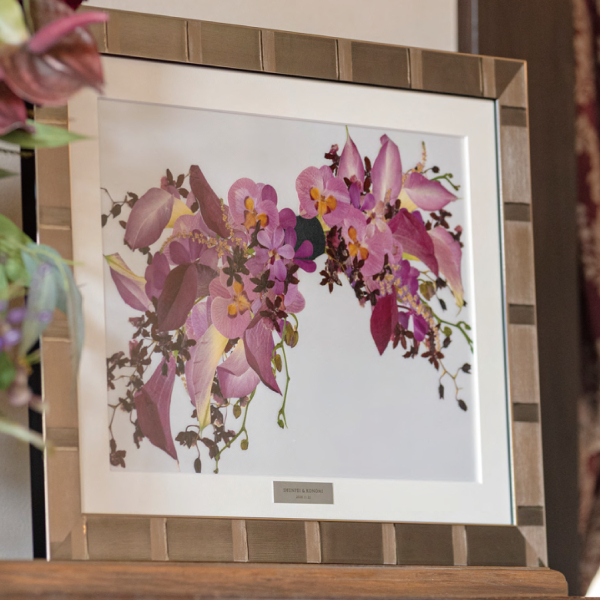 特許技術の乾燥方法で仕上げた押し花は、おふたりの愛のしるしとして額の中で美しく咲き続けます。プレートにはおふたりのお名前・記念日が刻まれ、たった一つの宝物になります。