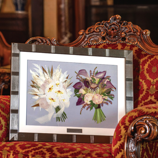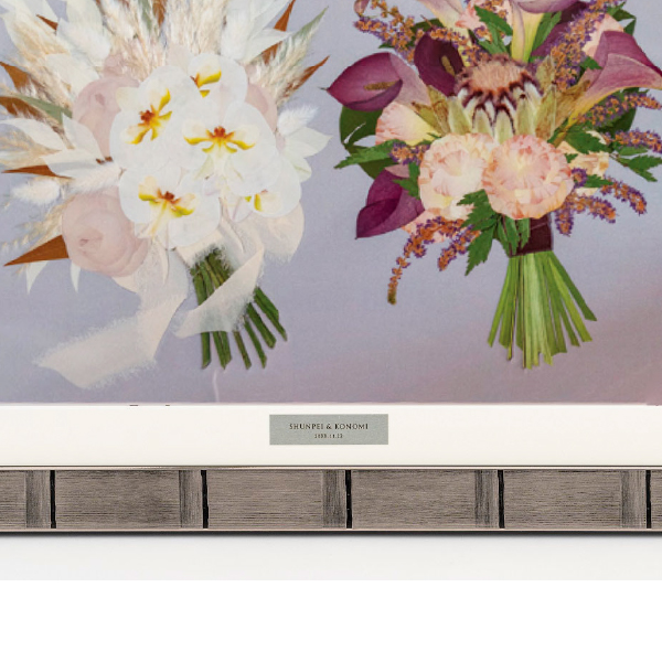 特許技術の乾燥方法で仕上げた押し花は、おふたりの愛のしるしとして額の中で美しく咲き続けます。プレートにはおふたりのお名前・記念日が刻まれ、たった一つの宝物になります。
