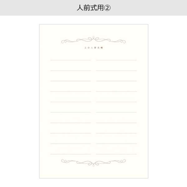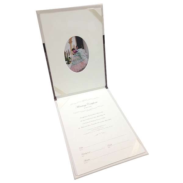 | 内容物 | チャペル式用:結婚証明書1枚、写真台紙 人前式用:結婚証明書1枚、立会人署名欄3枚(1枚20名様 計60名様分)、写真台紙 ※最大6枚まで閉じられます。 |