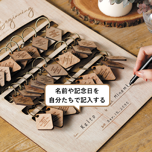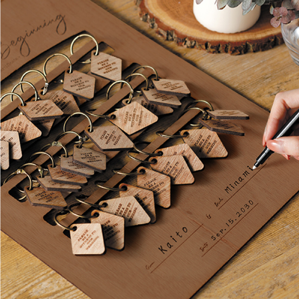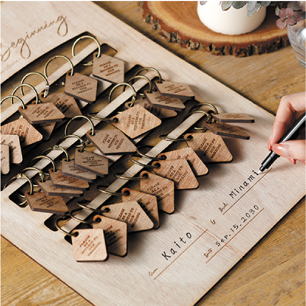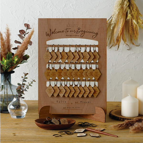 円おふたりの門出に寄り添う木のぬくもりとゲストのあたたかな「心」を感じるゲスト参加型な結婚証明書。ウェルカムスペースでゲストに記入をしてもらい、チャームをつけておふたりの結婚を承認します。ウェルカムスペースに設置することで、結婚式までの待ち時間にも期待感が高まる演出となります。