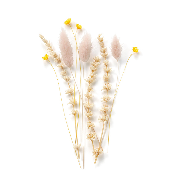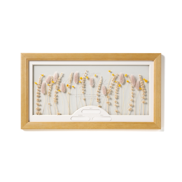 | 内容物 | ■フレーム本体 ■フラワー(予備を含めて48本) スターフラワーブロッサム イエロー×24本 ラグラス ピンクベージュ、ラベンダー クリームホワイト×各12本 ■壁掛け用紐 ■木製スタンドピン |