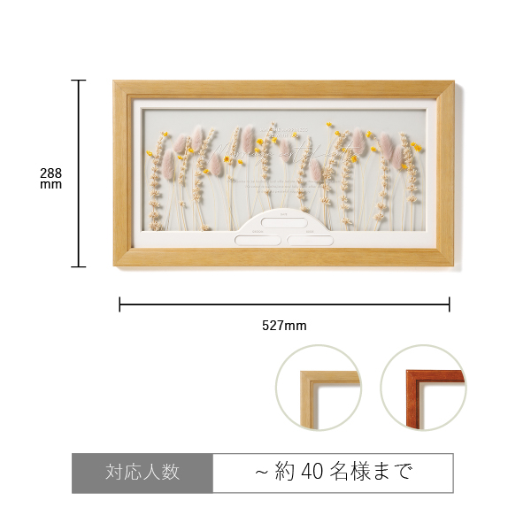 円ゲストさまに1本ずつお花を並べてもらうゲスト参加型の結婚証明書。一輪一輪気持ちを込めて並べたお花がこれからのおふたりの人生を華やかに彩る温かなセレモニーです。透き通ったアクリルボードとナチュラルカラーの枠がおしゃれな印象に。結婚式のあとは、想い出を飾るインテリアとして、新居に飾っていただけます。