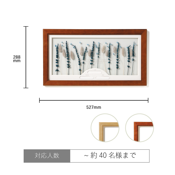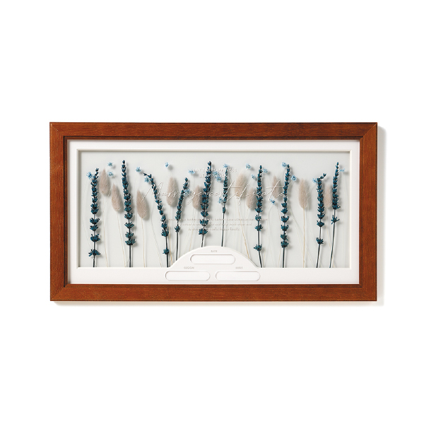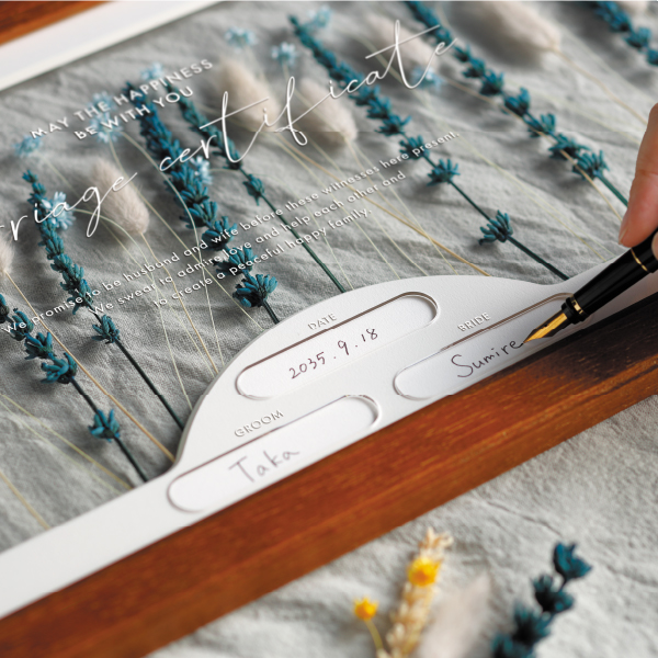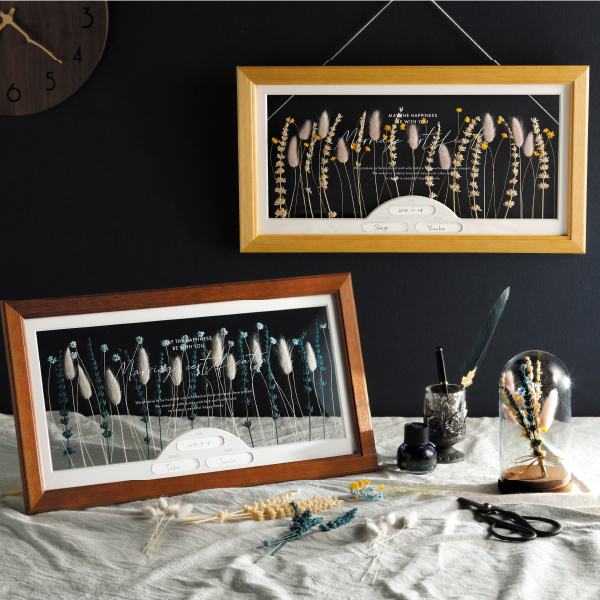 円ゲストさまに1本ずつお花を並べてもらうゲスト参加型の結婚証明書。一輪一輪気持ちを込めて並べたお花がこれからのおふたりの人生を華やかに彩る温かなセレモニーです。透き通ったアクリルボードとナチュラルカラーの枠がおしゃれな印象に。結婚式のあとは、想い出を飾るインテリアとして、新居に飾っていただけます。