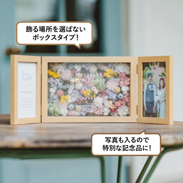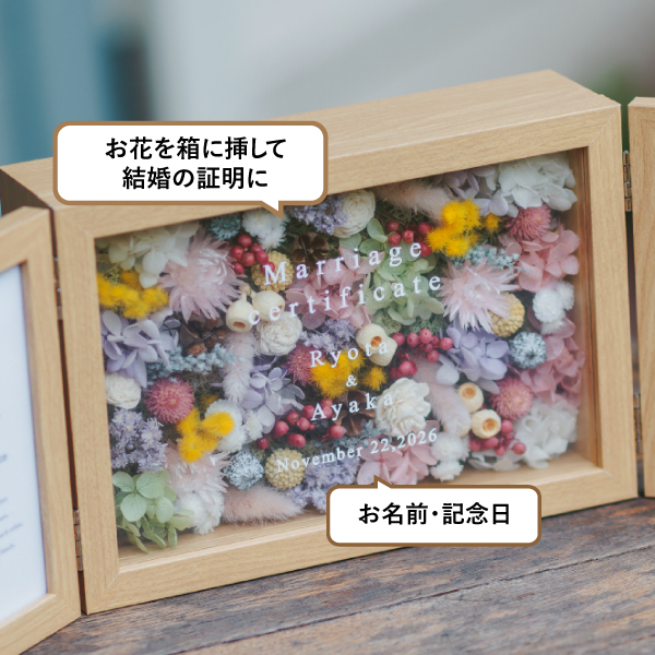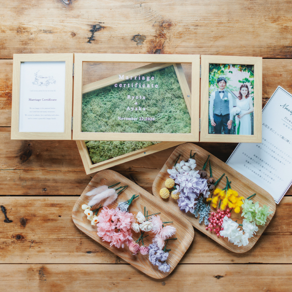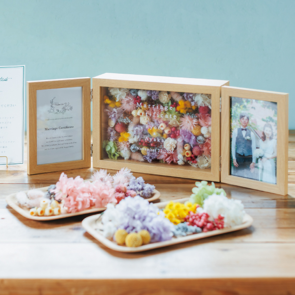 お花の種類も3種類。シックなドライフラワー。華やかなプリザーブドフラワー。美しいアーティフィシャルフラワー。カラフルで鮮やかなお花が結婚証明書を彩ります。