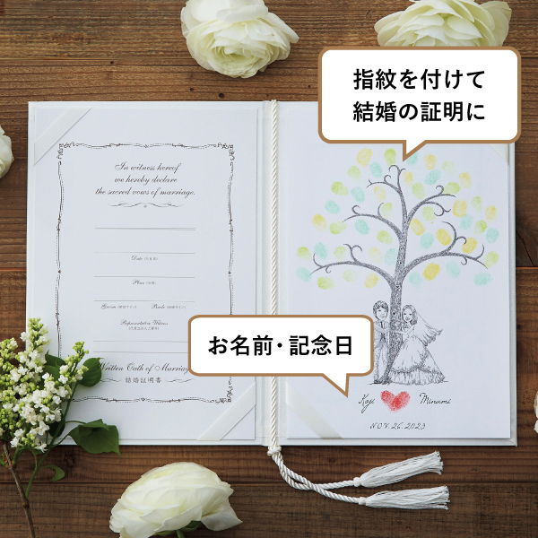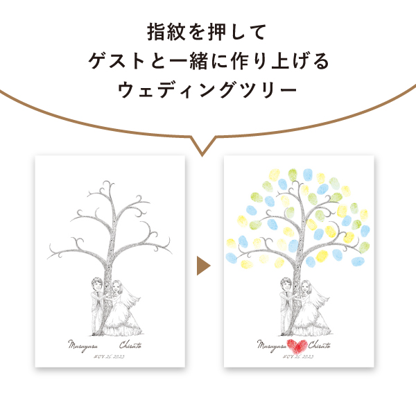 おふたりの似顔絵とゲストの指紋で完成するウェディングツリー指紋アート。ゲストに捺印してもらう指スタンプには、結婚を承認、祝福の気持ちが込められています。おふたりの指紋でハートをつくって、愛の詰まった世界に一つだけの結婚証明書になります。ゲストと一緒に作り上げる結婚証明書は、人前式におすすめです!