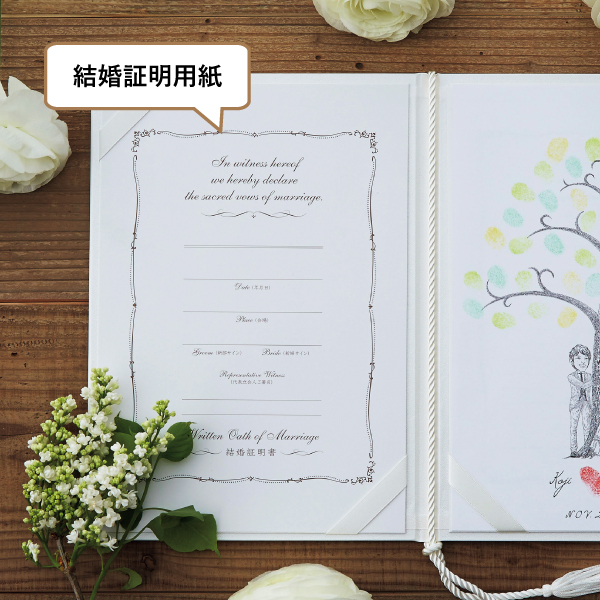 ■表紙1冊 ■似顔絵指紋アート・(用紙取り外し可)1枚 ■結婚証明書・(用紙取り外し可)1枚 ■押印用インク1個 |