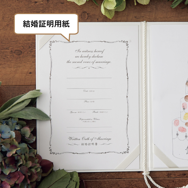 なし人前式をするため、ゲスト一人ひとりに承認をもらったという形が欲しく、こちらを注文しました。 私たちはウェディングケーキ入刀にこだわっているので、結婚証明書も自分たちらしいデザインにしました★