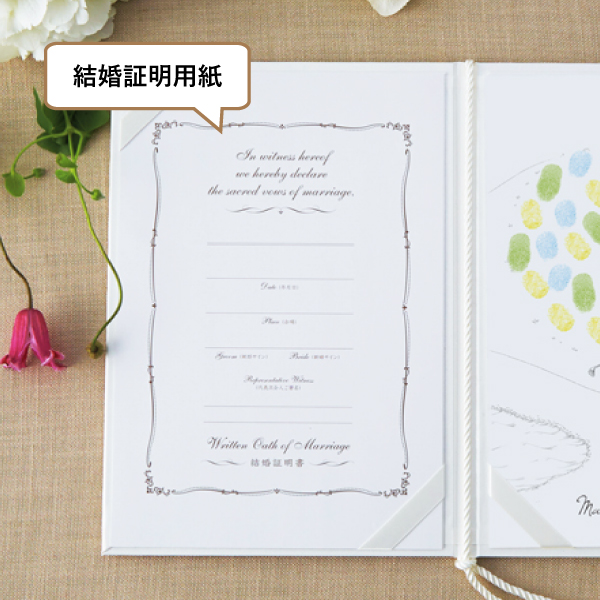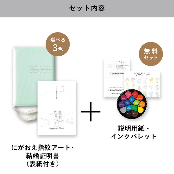 ■表紙1冊 ■似顔絵指紋アート・(用紙取り外し可)1枚 ■結婚証明書・(用紙取り外し可)1枚 ■押印用インク1個 |