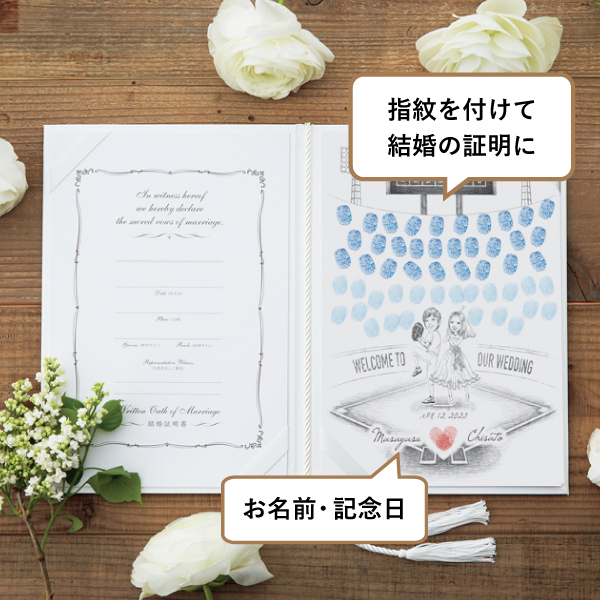 ■表紙1冊 ■似顔絵指紋アート・(用紙取り外し可)1枚 ■結婚証明書・(用紙取り外し可)1枚 ■押印用インク1個 |