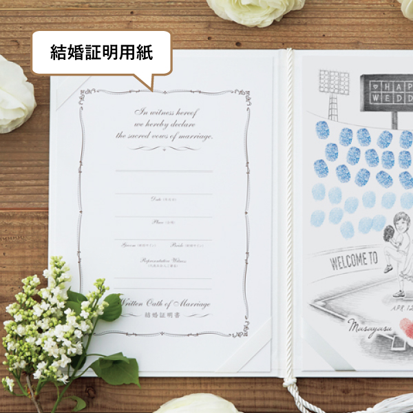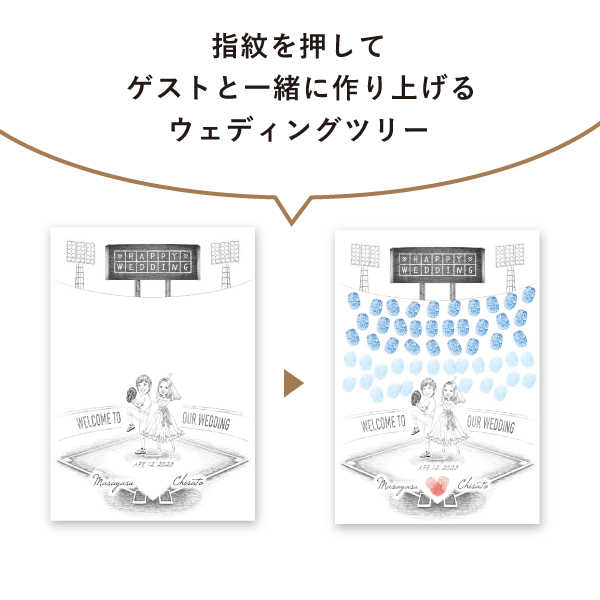 野球が好きな方にぴったりなデザイン!観客席にはおふたりを見守るようにゲストの指紋が並びます。夫婦一丸となって人生というペナントレースを進むおふたりを応援。