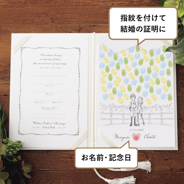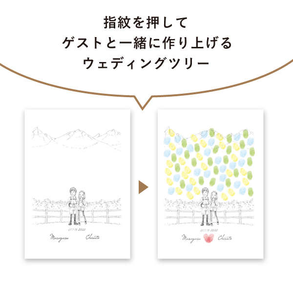 おふたりの似顔絵とゲストの指紋で完成するウェディングツリー指紋アート。ゲストに捺印してもらう指スタンプには、結婚を承認、祝福の気持ちが込められています。おふたりの指紋でハートをつくって、愛の詰まった世界に一つだけの結婚証明書になります。ゲストと一緒に作り上げる結婚証明書は、人前式におすすめです!