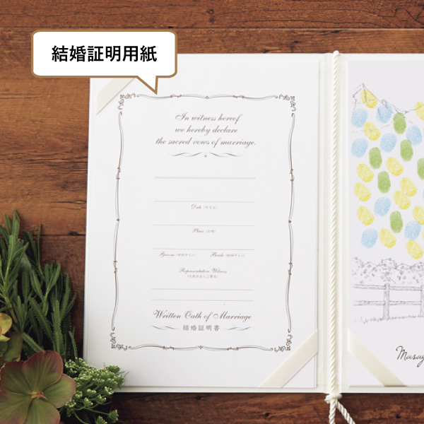 ■表紙1冊 ■似顔絵指紋アート・(用紙取り外し可)1枚 ■結婚証明書・(用紙取り外し可)1枚 ■押印用インク1個 |