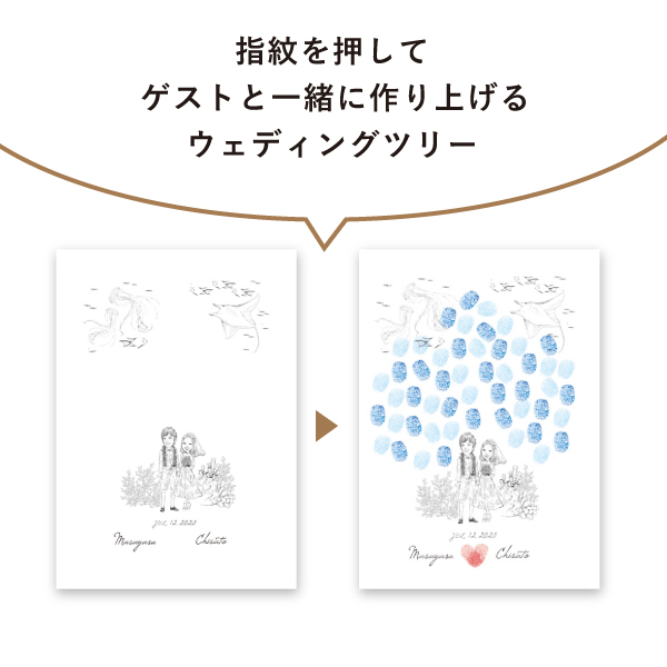 おふたりの似顔絵とゲストの指紋で完成するウェディングツリー指紋アート。ゲストに捺印してもらう指スタンプには、結婚を承認、祝福の気持ちが込められています。おふたりの指紋でハートをつくって、愛の詰まった世界に一つだけの結婚証明書になります。ゲストと一緒に作り上げる結婚証明書は、人前式におすすめです!