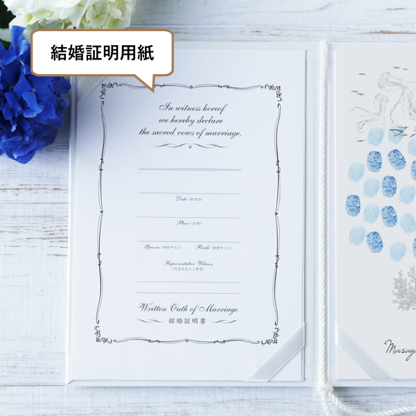 ■表紙1冊 ■似顔絵指紋アート・(用紙取り外し可)1枚 ■結婚証明書・(用紙取り外し可)1枚 ■押印用インク1個 |