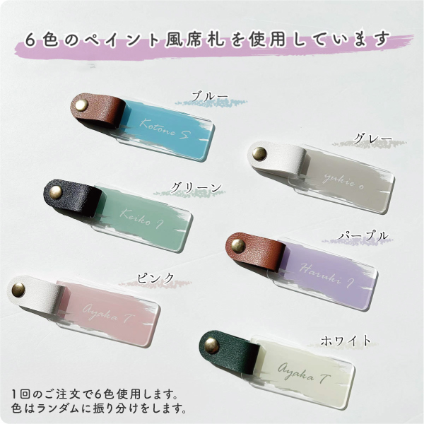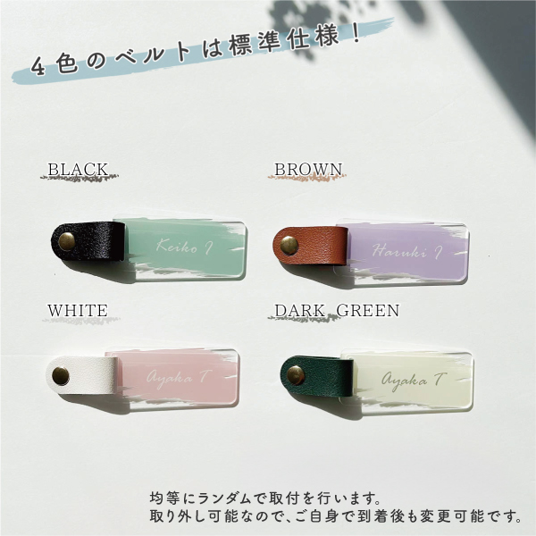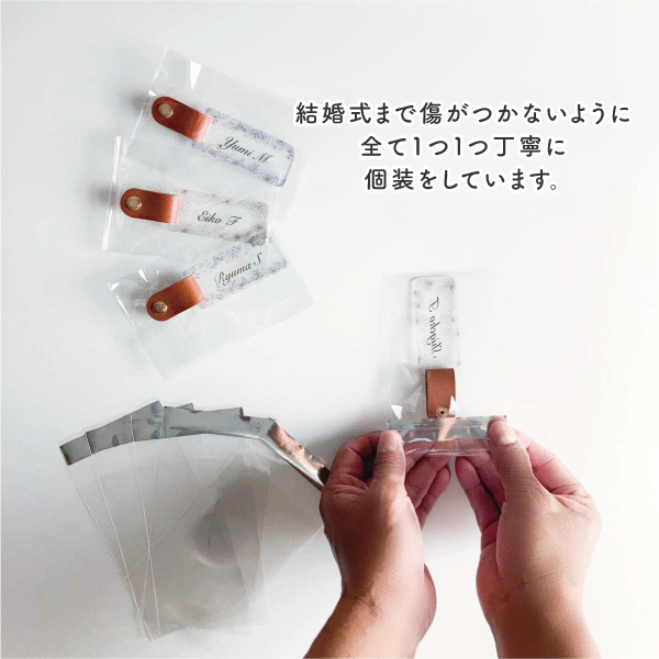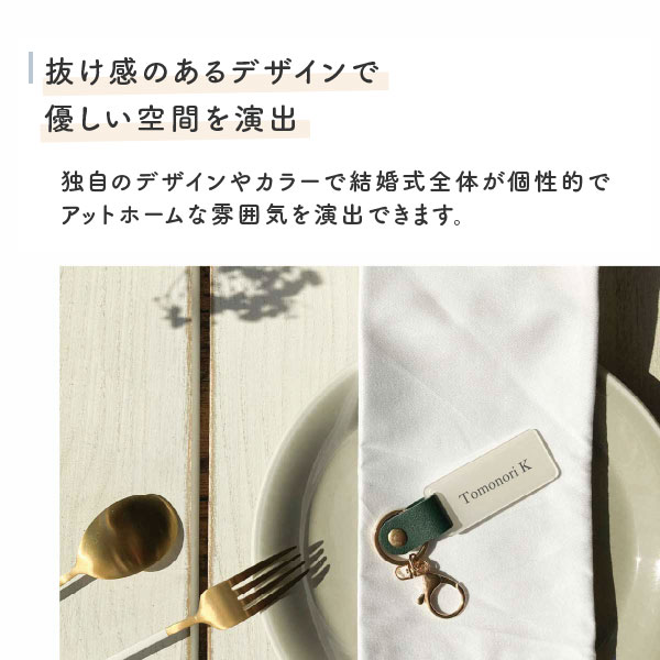 | 内容物 | ・席札本体(ペイント風席札・長方形・アクリル製) ・レザーベルト付き(挙式後はゴルフバッグや旅行にも活用可能) ※ キーホルダー仕様 |