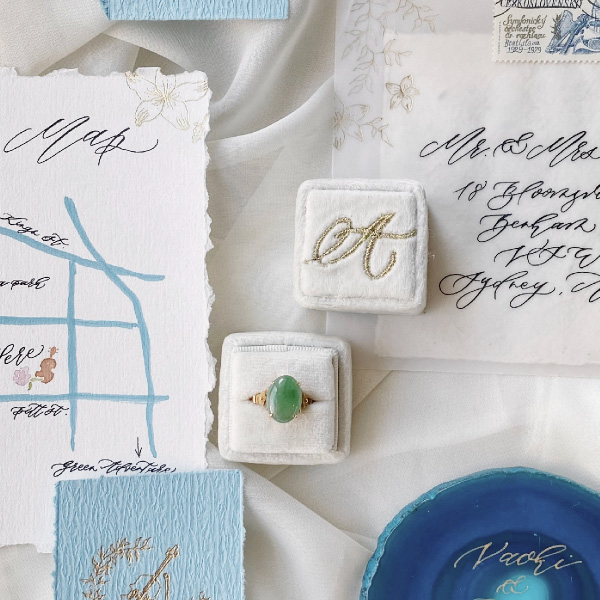 7種類のベルベットカラーと4色の刺繍カラーを組み合わせ、カリグラフィーも加わり世界にひとつだけのオリジナルボックスになります。