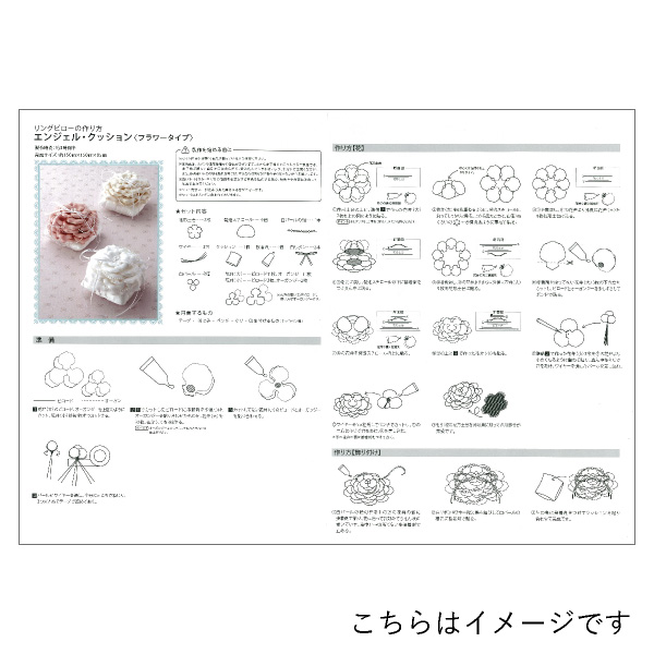 | 内容物 | ・布・・・2枚 ・綿・・・1パック ・レース・・・1枚 ・ビーズ・・・30粒 ・造花・・・1個 ・3mm幅のリボン・・・1本 ・6mm幅のリボン・・・1本 |