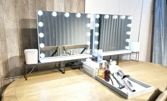 撮影前の身だしなみを整えられるパウダールームをご用意。ヘアアイロンやコテ、ヘアオイルも自由に使えるので、思い通りのスタイリングで撮影できます。