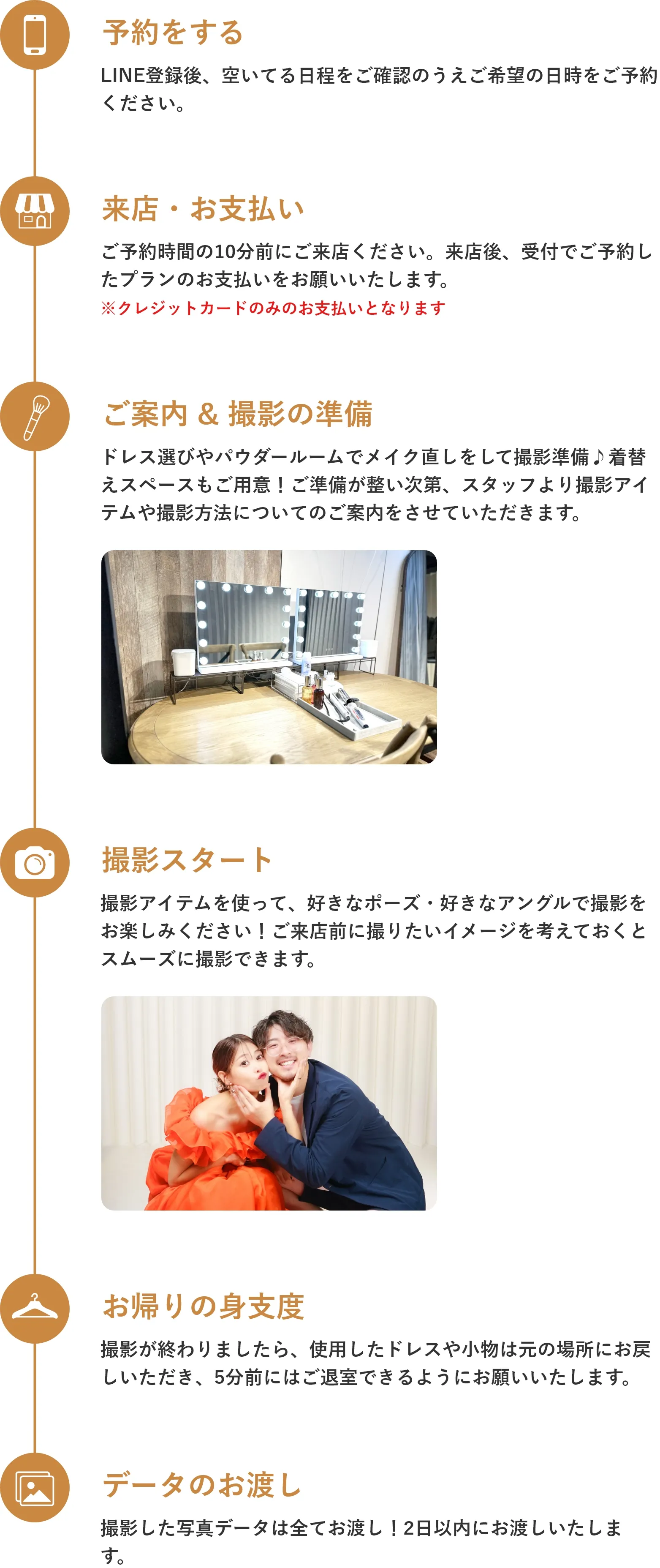 もちろんお気に入りの衣装を持ち込むこともOK!自由なスタイルで、自分たちだけのオリジナル撮影をお楽しみいただけます。