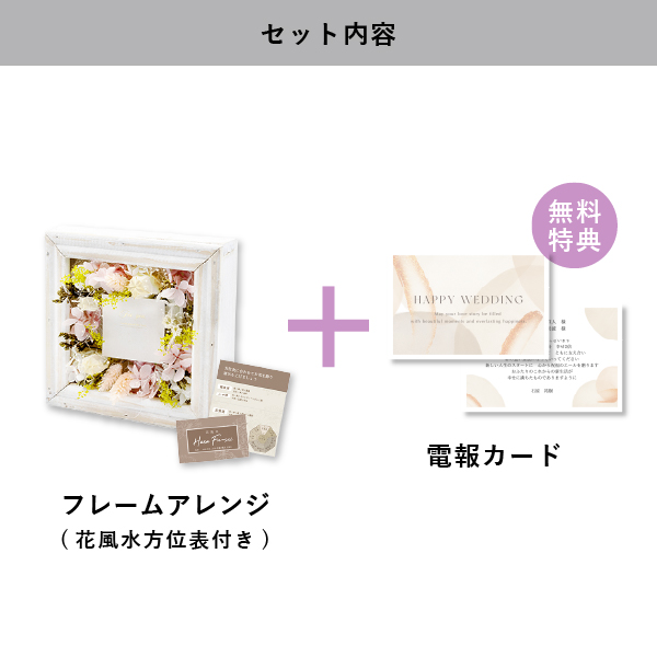 箔押しのメッセージカードが上品な2wayのフレームアレンジができ、さまざまな会場に馴染みやすいナチュラルなフレームフラワーです。インテリアとしてもお使いいただけるさり気ないサイズ感とデザインは、挙式後も長く飾って楽しむことができるので、想い出に残るお祝いギフトになります!