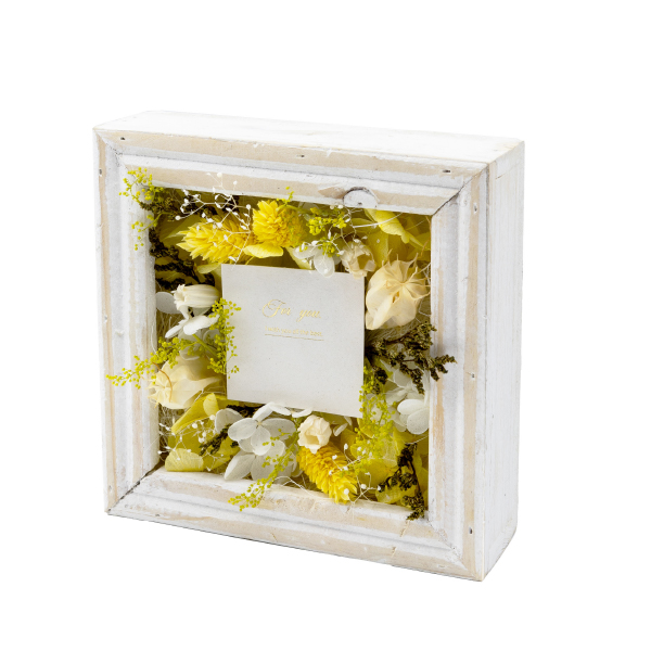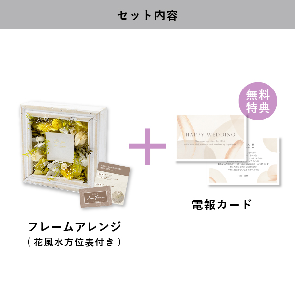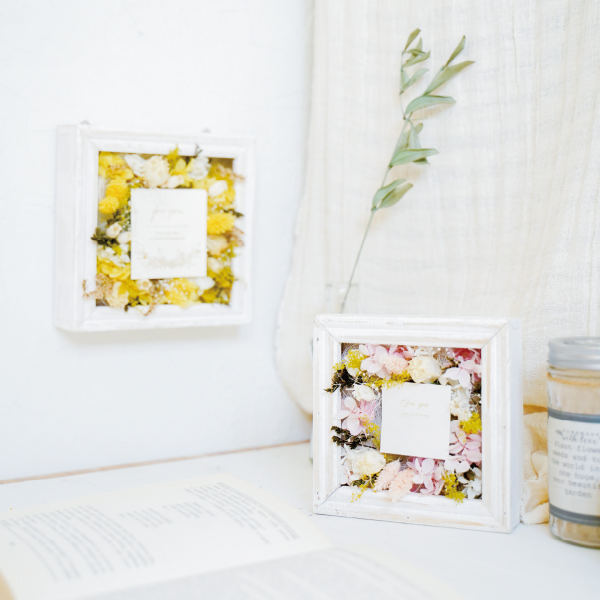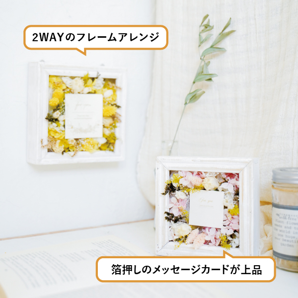 箔押しのメッセージカードが上品な2wayのフレームアレンジができ、さまざまな会場に馴染みやすいナチュラルなフレームフラワーです。インテリアとしてもお使いいただけるさり気ないサイズ感とデザインは、挙式後も長く飾って楽しむことができるので、想い出に残るお祝いギフトになります!