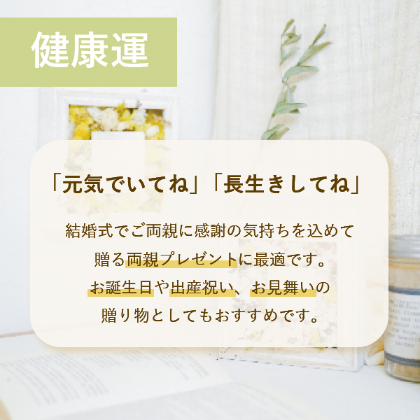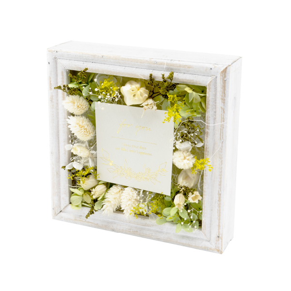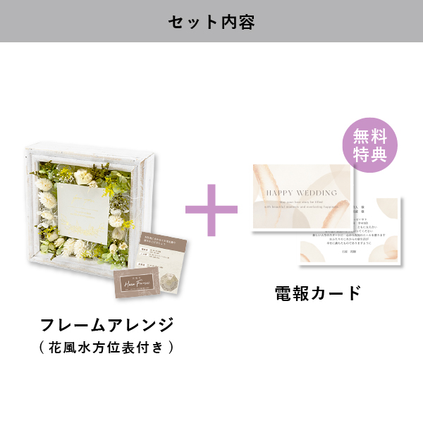 箔押しのメッセージカードが上品な2wayのフレームアレンジができ、さまざまな会場に馴染みやすいナチュラルなフレームフラワーです。インテリアとしてもお使いいただける華やかなデザインは、挙式後も長く飾って楽しむことができるので、想い出に残るお祝いギフトになります!