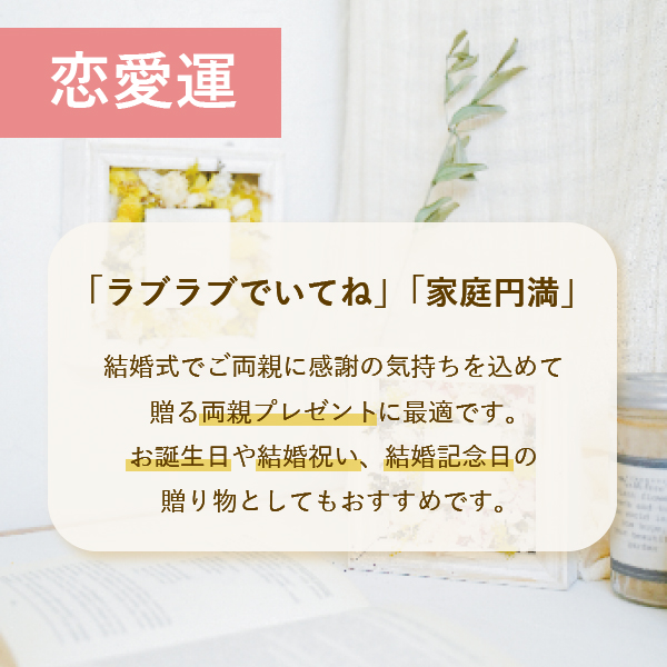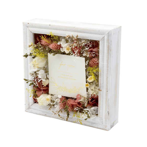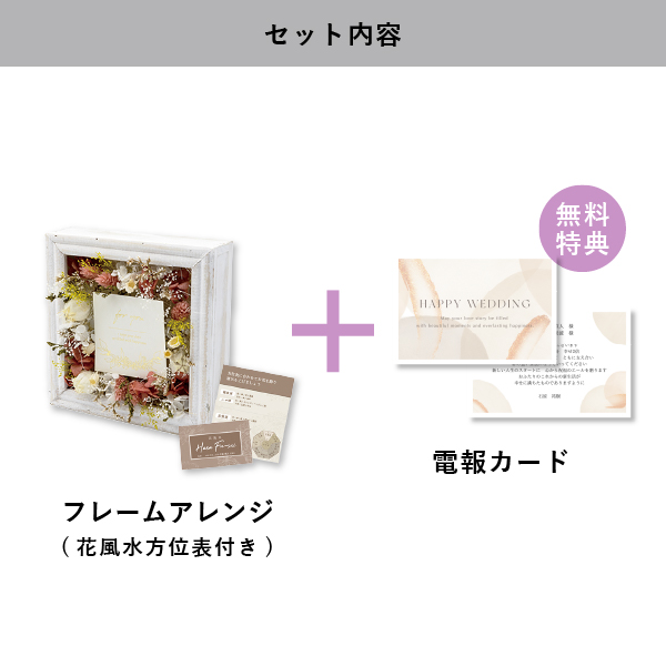 箔押しのメッセージカードが上品な2wayのフレームアレンジができ、さまざまな会場に馴染みやすいナチュラルなフレームフラワーです。インテリアとしてもお使いいただける華やかなデザインは、挙式後も長く飾って楽しむことができるので、想い出に残るお祝いギフトになります!