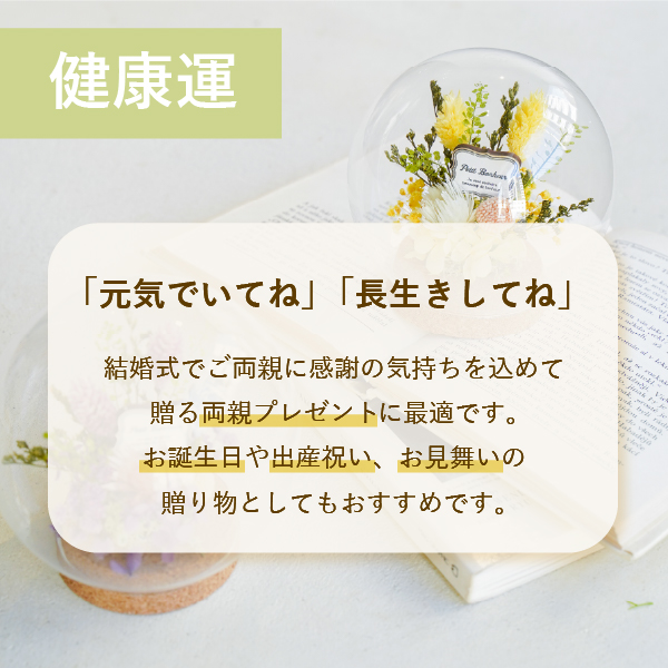 女性らしく可愛らしい印象が美しいプリザーブドフラワーとドライフラワーを使用し、おしゃれなピックのメッセージを付けました。やさしい雰囲気のまるいガラスドームは、置くだけで特別な空間にしてくれるアイテム。360度どの角度から見ても楽しめるデザインは、挙式後も長く飾って楽しむことができるのでおすすめのアイテムです。健康運UPのグリーンカラーは大切な方への贈り物にも最適です。