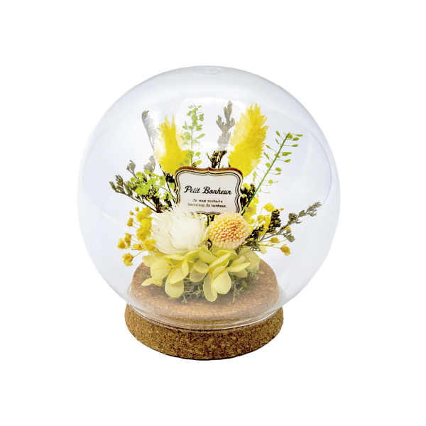 女性らしく可愛らしい印象が美しいプリザーブドフラワーとドライフラワーを使用し、おしゃれなピックのメッセージを付けました。やさしい雰囲気のまるいガラスドームは、置くだけで特別な空間にしてくれるアイテム。360度どの角度から見ても楽しめるデザインは、挙式後も長く飾って楽しむことができるのでおすすめのアイテムです。仕事運UPのイエローカラーは大切な方への贈り物にも最適です。