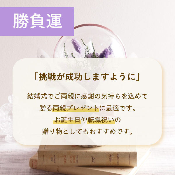 自立するためインテリアとしてもお使いいただけるおしゃれなデザイン。挙式後も長く飾って楽しむことができるので、想い出に残るお祝いギフトになります!勝負運UPのパープルカラーは大切な方への贈り物にも最適です。
