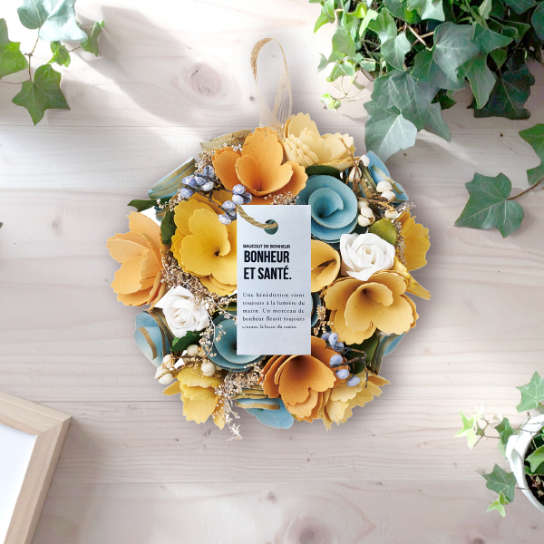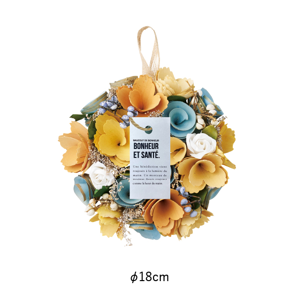 イエローカラーをベースにブルーが映えるリースは、メリハリのある爽やかなな印象に◎リースは切れ目がなく、始まりも終わりもない円の形をしていることから、「永遠」の意味を持ち、結婚式にはぴったりの贈り物です。挙式後も長く飾って楽しむことができるので、想い出に残る記念品に!ウェディングから毎日のインテリアまで、季節を超えて楽しめるアイテムです。