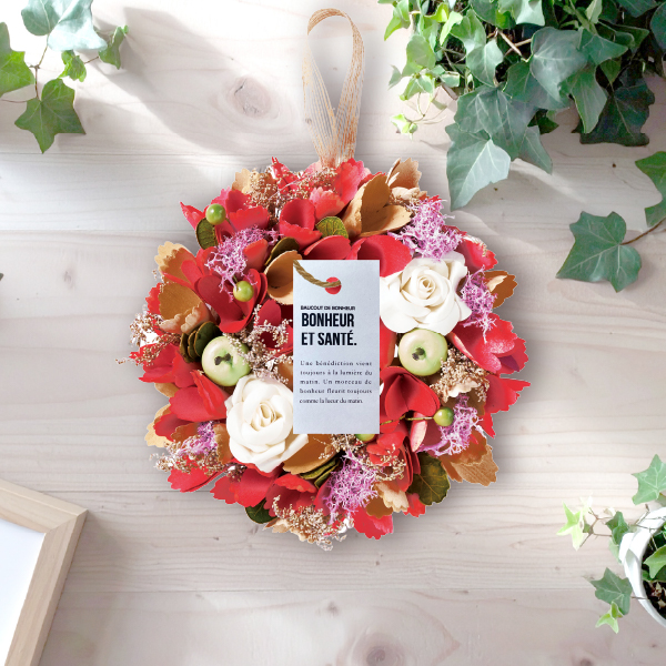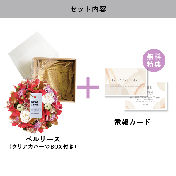 「二人の幸せが永遠に続きますように…」と願いを込めて贈る、彩りをもたらす華やかなベルリース電報です。