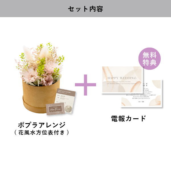 「たくさんの幸せが訪れますように…」と願いを込めて贈るオリジナルカード付のフラワー電報です。パッケージのまま渡せるころんとかわいいポプラアレンジは、記憶に残るフラワーギフトです。挙式後も長く飾って楽しむことができるので、想い出に残るお祝いギフトに!毎日のインテリアまで、季節を超えて楽しめるアイテムです。大切な方への贈り物にも最適です。