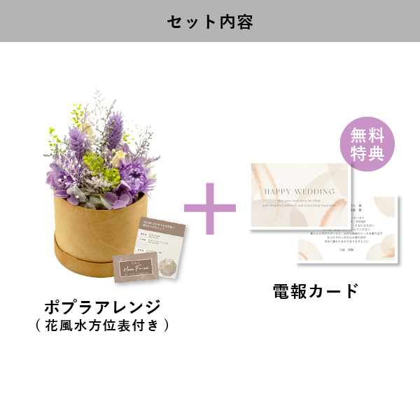 「たくさんの幸せが訪れますように…」と願いを込めて贈るオリジナルカード付のフラワー電報です。パッケージのまま渡せるころんとかわいいポプラアレンジは、記憶に残るフラワーギフトです。挙式後も長く飾って楽しむことができるので、想い出に残るお祝いギフトに!毎日のインテリアまで、季節を超えて楽しめるアイテムです。大切な方への贈り物にも最適です。