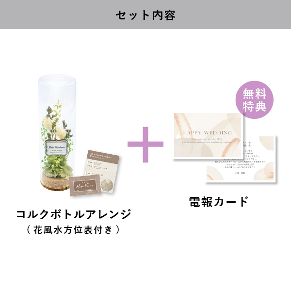 「たくさんの幸せが訪れますように…」と願いを込めて贈るオリジナルカード付のフラワー電報です。コンパクトで飾りやすい、どんなお部屋にも馴染むコルクアレンジです。挙式後も長く飾って楽しむことができるので、想い出に残るお祝いギフトに!季節を超えて楽しめるアイテムです。