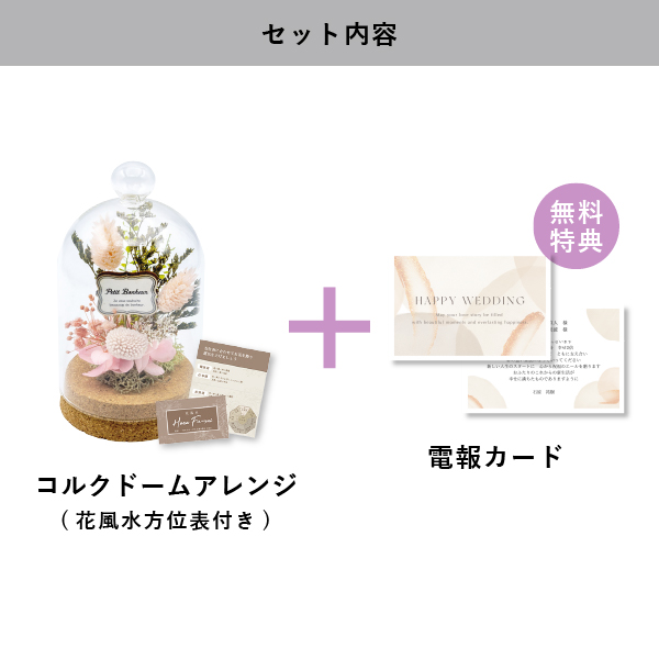 「たくさんの幸せが訪れますように…」と願いを込めて贈るオリジナルカード付のフラワー電報です。コンパクトで飾りやすい、どんなお部屋にも馴染むコルクアレンジ。挙式後も長く飾って楽しむことができるので、想い出に残るお祝いギフトに!季節を超えて楽しめるアイテムです。