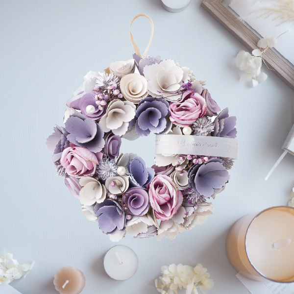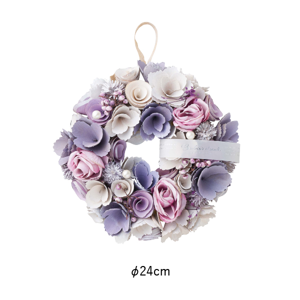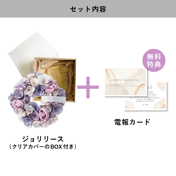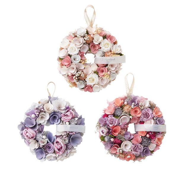 「幸せがずっと続きますように…」と願いを込めて贈るオリジナルカード付のフラワー電報です。程よい大きさのサイズが大人の女性に喜ばれる、上品でかわいいパープルピンクのリースです。リースは切れ目がなく、始まりも終わりもない円の形をしていることから、「永遠」の意味を持ち、結婚式にはぴったりの贈り物です。挙式後も長く飾って楽しむことができるので、想い出に残るお祝いギフトに!季節を超えて楽しめるアイテムです。