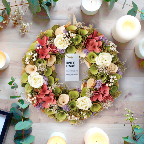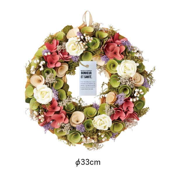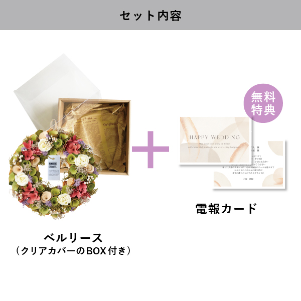 「幸せがずっと続きますように…」と願いを込めて贈るオリジナルカード付のフラワー電報です。リラックス効果や疲労回復効果などがあると言われるグリーンは、見る人の心を癒やしてくれるでしょう。存在感のある大きさが華やかな雰囲気を演出します。 リースは切れ目がなく、始まりも終わりもない円の形をしていることから、「永遠」の意味を持ち、結婚式にはぴったりの贈り物です。挙式後も長く飾って楽しむことができるので、想い出に残るお祝いギフトに!季節を超えて楽しめるアイテムです。