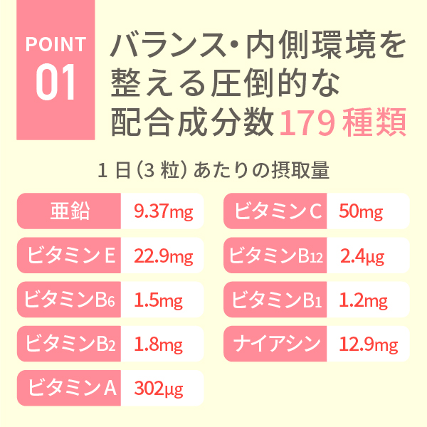| 成分 | 亜麻仁油(国内製造)、田七人参エキス末、、キバナオウギ茎エキス末、デキストリン、マカエキス末(マカエキス末、酸素分解マカ粉末)、コエンザイムQ10(還元型)、ビタミンE含有植物油、大豆抽出物、DHA・EPA含有生成魚油、セレン含有酵母、αリポ酸、ザクロエキス末、米胚芽エキス末、植物発酵エキス末、イナゴマメ抽出物、醗酵黒ニンニク末、イソマルトオリゴ糖、スピルリナ原末、L-カルニチンフマル酸塩、ローヤルゼリー末、乾燥ビール酵母、海藻カルシウム、キヌア発芽粉末、野菜粉末(大麦若葉、ケール、ブロッコリー、南瓜、桑の葉、セロリ、パセリ、ほうれん草、人参、トマト、ゴーヤ、チンゲン菜、モロヘイヤ、よもぎ)、たんぽぽ粉末、高麗人参エキス末、生姜エキス/ゼラチン、グリセリン、グルコン酸亜鉛、ピロリン酸第二鉄、グリイセリン脂肪酸エステル、ミツロウ、V.C、カラメル色素、ナイアシン、卵殻カルシウム、V.B6、V.B2、V.B1、葉酸、V.A、ラクトフェリン(乳由来)、塩化カリウム、V.B12、V.D(原材料の一部に、卵、大豆、リンゴ、キウイフルーツ、バナナ、モモ、ゼラチンを含む) |