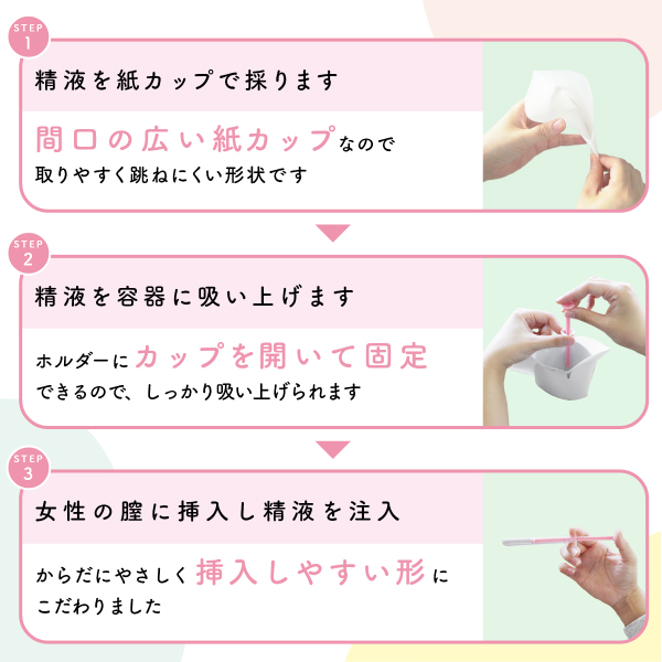 | 使用方法 | 1.男性が精液を間口の広い紙カップで採取します。 2.精液を容器本体に入れます。 3.女性の膣に挿入し精液を注入します。 |