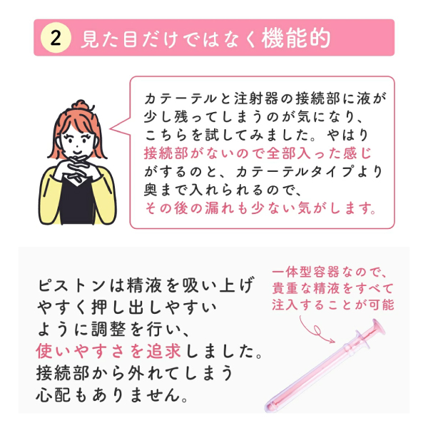 ・一体型容器なので精液の漏れや脱落が起こりにくいです。