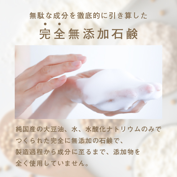 成分は天然成分「国産(鹿児島県産)大豆油」「水」「水酸化Na」のみ。添加物を一切使用していない【完全無添加石鹸】です。