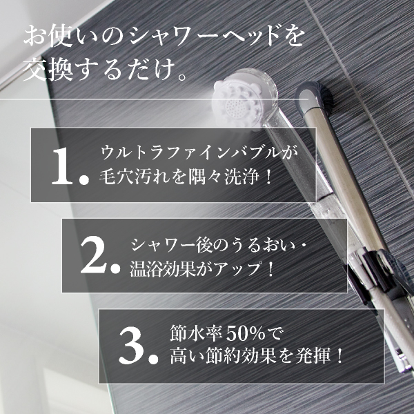 浴室のシャワーヘッドを取り替えるだけで、毛穴の奥まで届くウルトラファインバブル(超微細気泡)を生成。