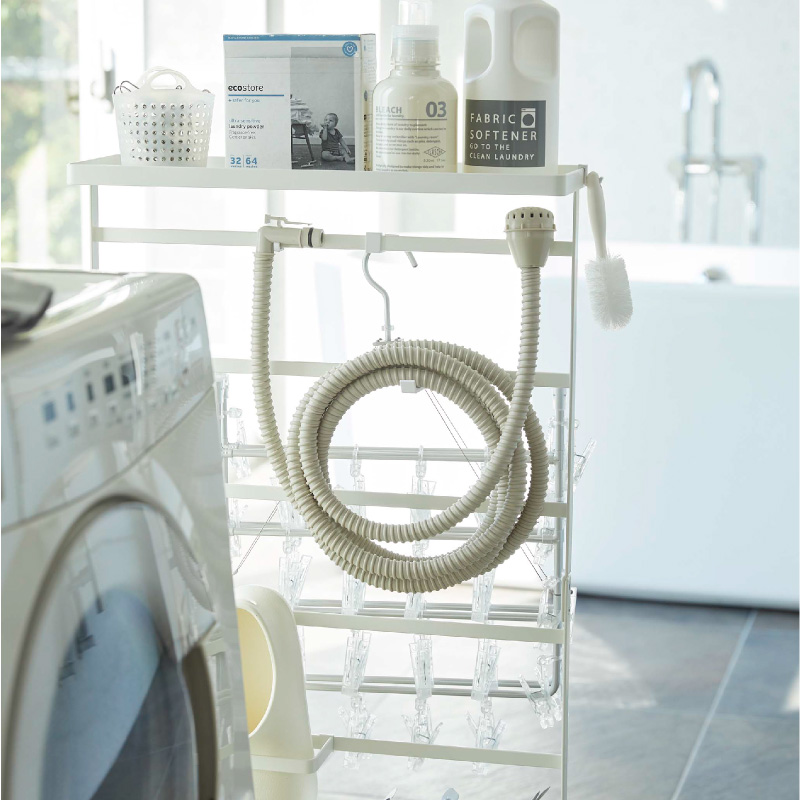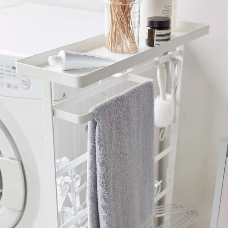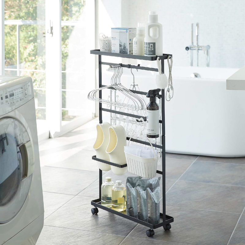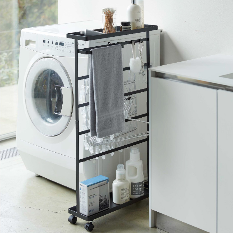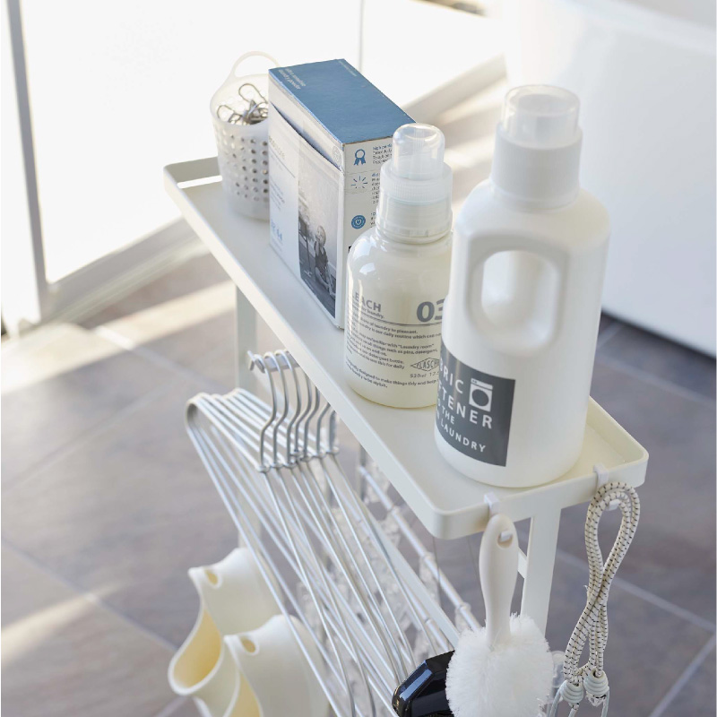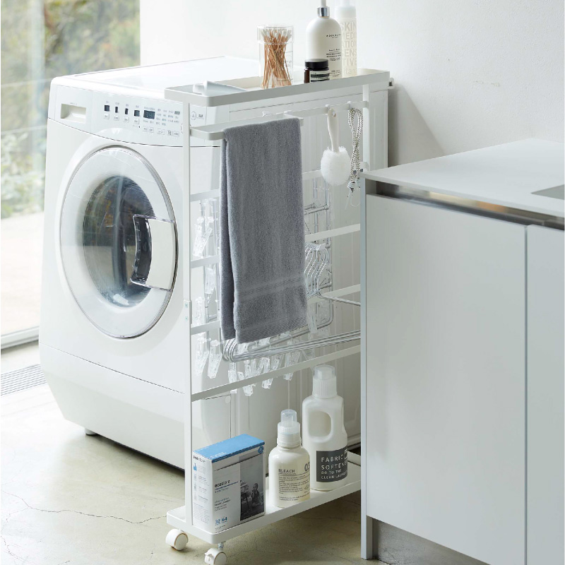 上部トレーは、洗剤ボトルなどを収納でき洗濯作業もスムーズに。下部トレーはバス用品のストック収納にもなります。