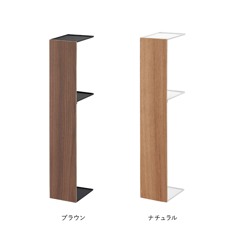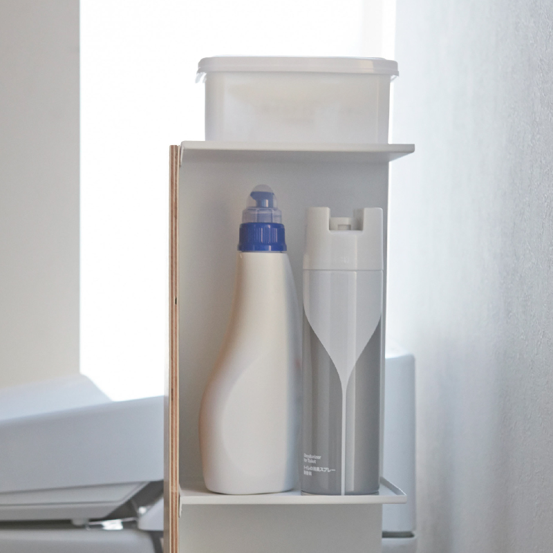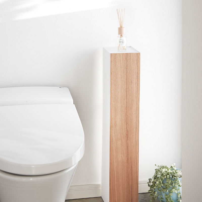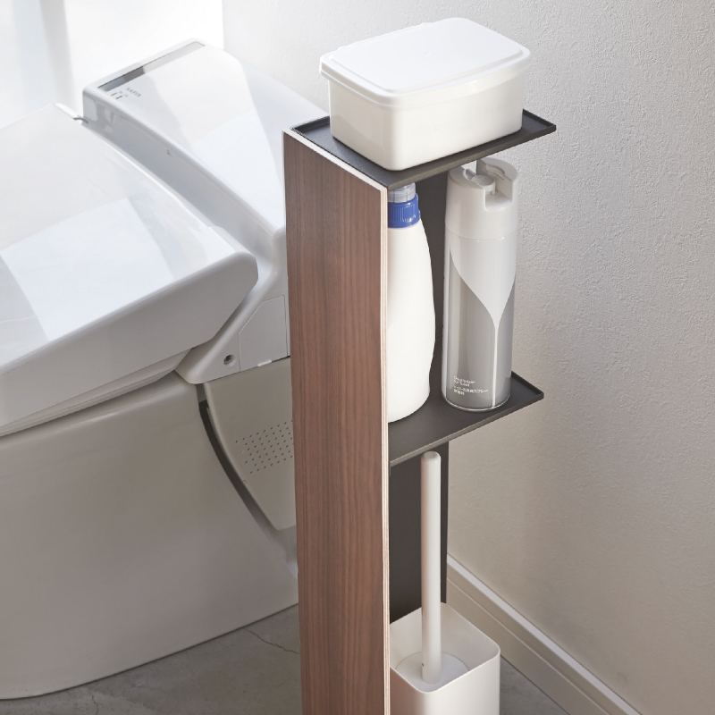 美しい木目でインテリア性のあるスタイリッシュなデザインのスリムトイレラック。トイレブラシやトイレ用洗剤など掃除用具からトイレットロールペーパーなどを隠して一括収納