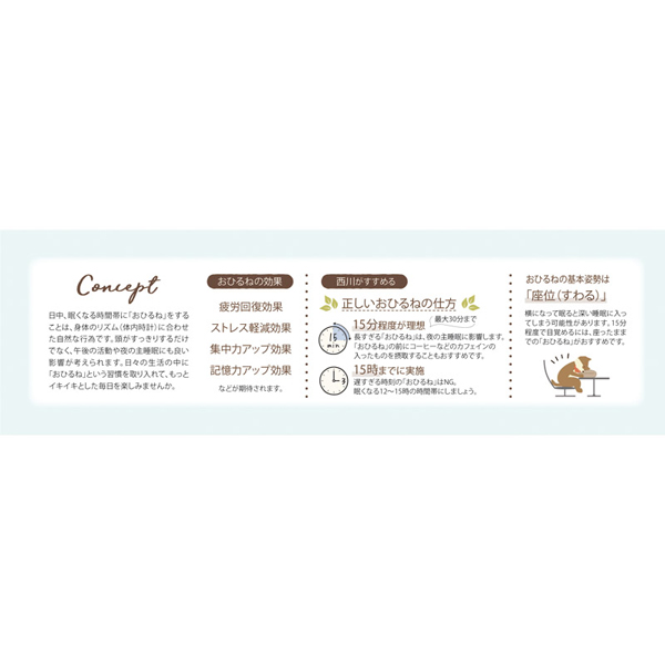 「パワーナップ」とは短時間の昼寝のことで、仕事の生産性を上げる手段として効果的。からだのリズム(体内時計)に合わせて、午後の仕事に取りかかる前にお昼寝をすることで、頭がスッキリし集中力アップが期待できます。「こねむり」は、そんなパワーナップをサポートするアイテムです!