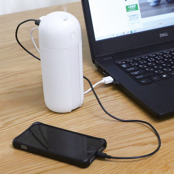 本体充電中はUSBでアウトプットができるので、スマートフォンなどの充電の中継にも使えて便利です。■加湿能力:約30ml/h(±20%)■タンク容量:約250ml■充電時間:約2時間■連続使用可能時間:約2時間