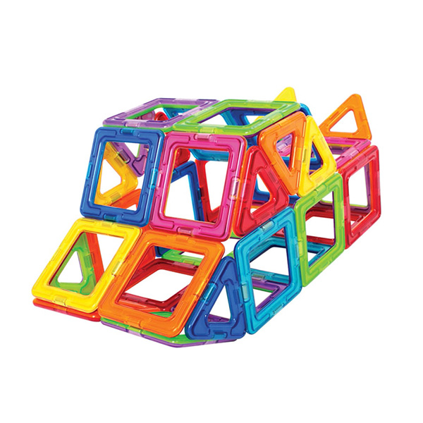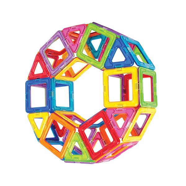 正方形がたくさん入っているので、横に並べたり高く積み上げたりと平面と三次元を行き来し、思う存分かたち遊びから構成遊び、立体モチーフづくりまで広がります。正三角形は2つでひし形、3つで台形、5つで五角形と形を変え、遊びながら図形への理解が深まります。さらに、五角形があれば曲線に近い形を表現でき、具体的なモチーフや構造物づくりとステップアップして楽しめます。ピース数も多く、友だちやきょうだいで一緒に遊べます。