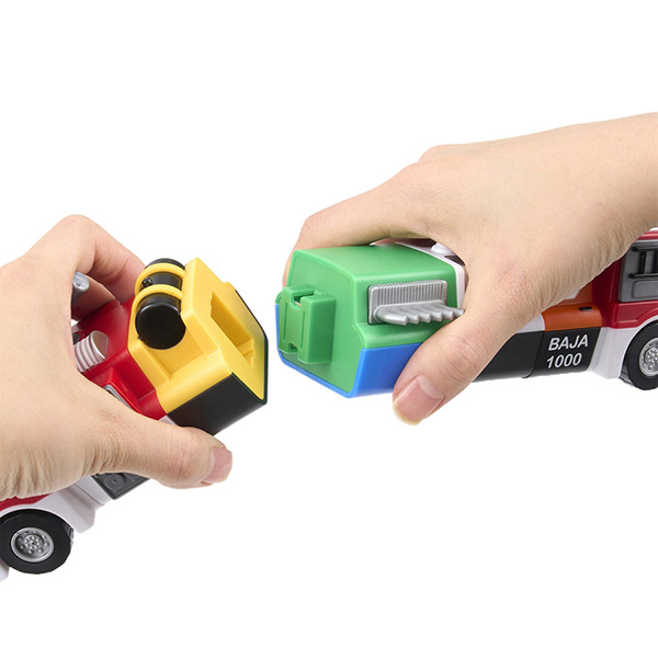 磁石の力で簡単につけたり外したりできるボディを自由に組み合わせ、頭の中に思い描いた想像の乗り物が完成する「ミックス&マッチシリーズ」のデラックス版。消防車・スペースレンジャー・ピックアップトラック・ポリスヘリコプター・蒸気機関車・スピードレーサー・ホイールローダーと働きが異なる7種の乗り物がセットになっています。車が大好きなお子様にぴったりのセットです。