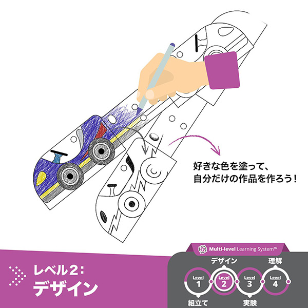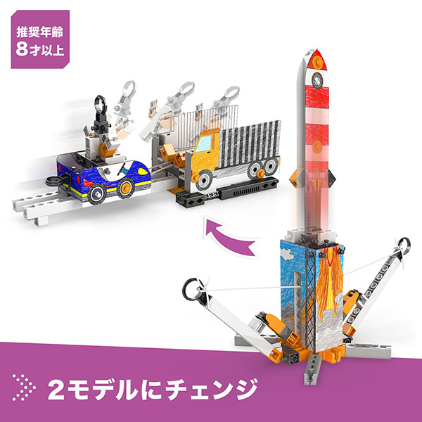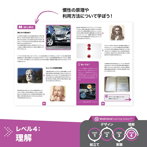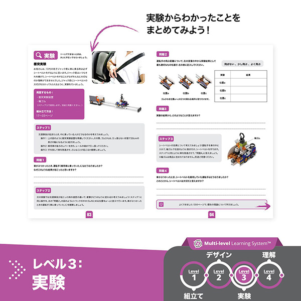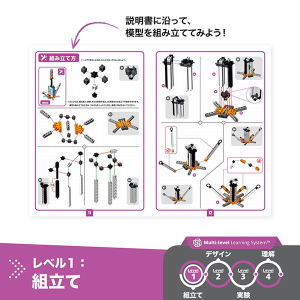 付属のワークブックを活用しテーマである「慣性」について学び、設計図を見ながら実際に慣性を活用した模型を作成、正しく作れているか実験・考察することができます。このステップに沿って作ることで、まさにエンジニアが機械を作る際のプロセスを学ぶことができる、エンジニアリングブロックです。リアリティをもって現実社会で扱われている技術に挑戦できる、ブロック遊びにとどまらないものづくりの力が身に付きます。自然や科学の原理がわかり点と点がつながると、毎日あたりまえだった世界が大きく変わって見えてくる、そんな「なるほど!そうだったのか!」を、ぜひ体感してみてください。